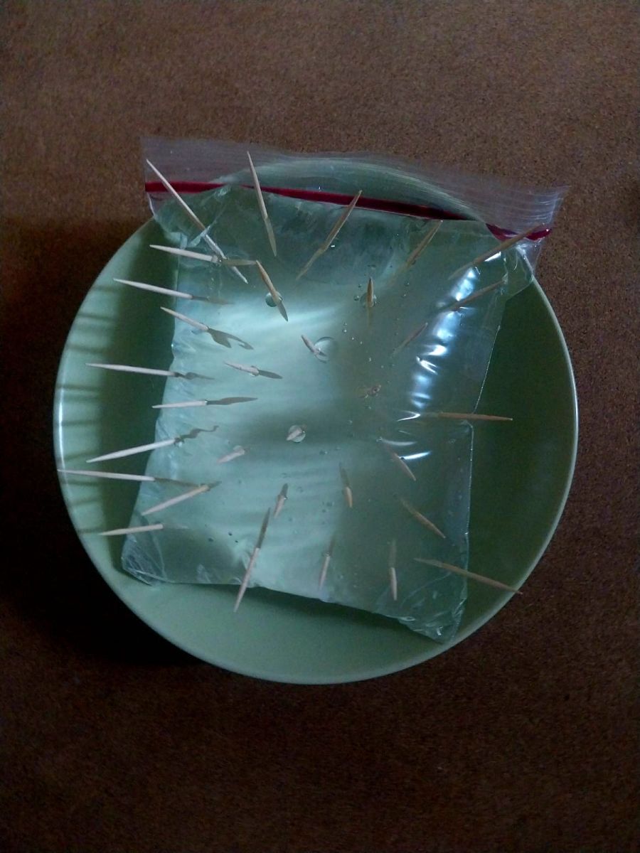 Postup: Plastové vrecko naplňte vodou a uzavrite, aby voda nevytekala. Pozor, malo by byť celkom naplnené bez vzduchových bublín. Ak chcete, môžete vodu zafarbiť. Pripravte si špáradlá. Potom sa zamyslite, čo sa stane s vodou vo vrecku po prepichnutí špáradlom a stanovte hypotézu. Napríklad upravte vetu: Po prepichnutí vrecka s vodou pomocou špáradiel voda z vrecka vytečie / nevytečie.